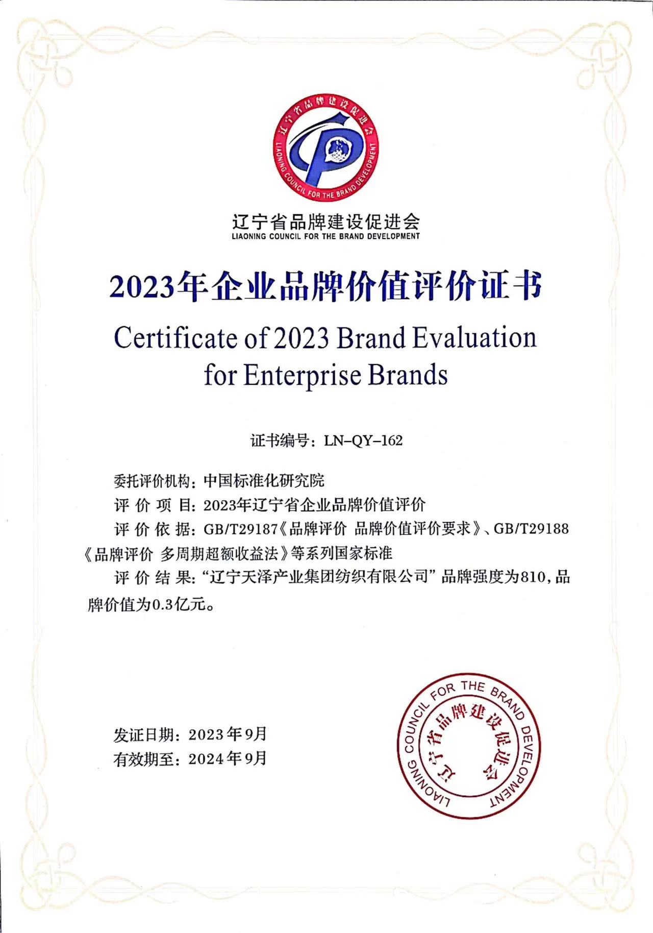 遼寧天澤紡織公司榮獲2023年企業(yè)品牌價值評價證書